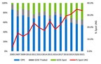 Gas on Gas (GOG) pricing share was marginally down by 0.3% – at 49% of total world gas consumption, a slowdown in a strong trend toward increasing GOG over the years. This is up by more than 50%, compared to 31.3% in 2005 when the IGU launched its first survey.
